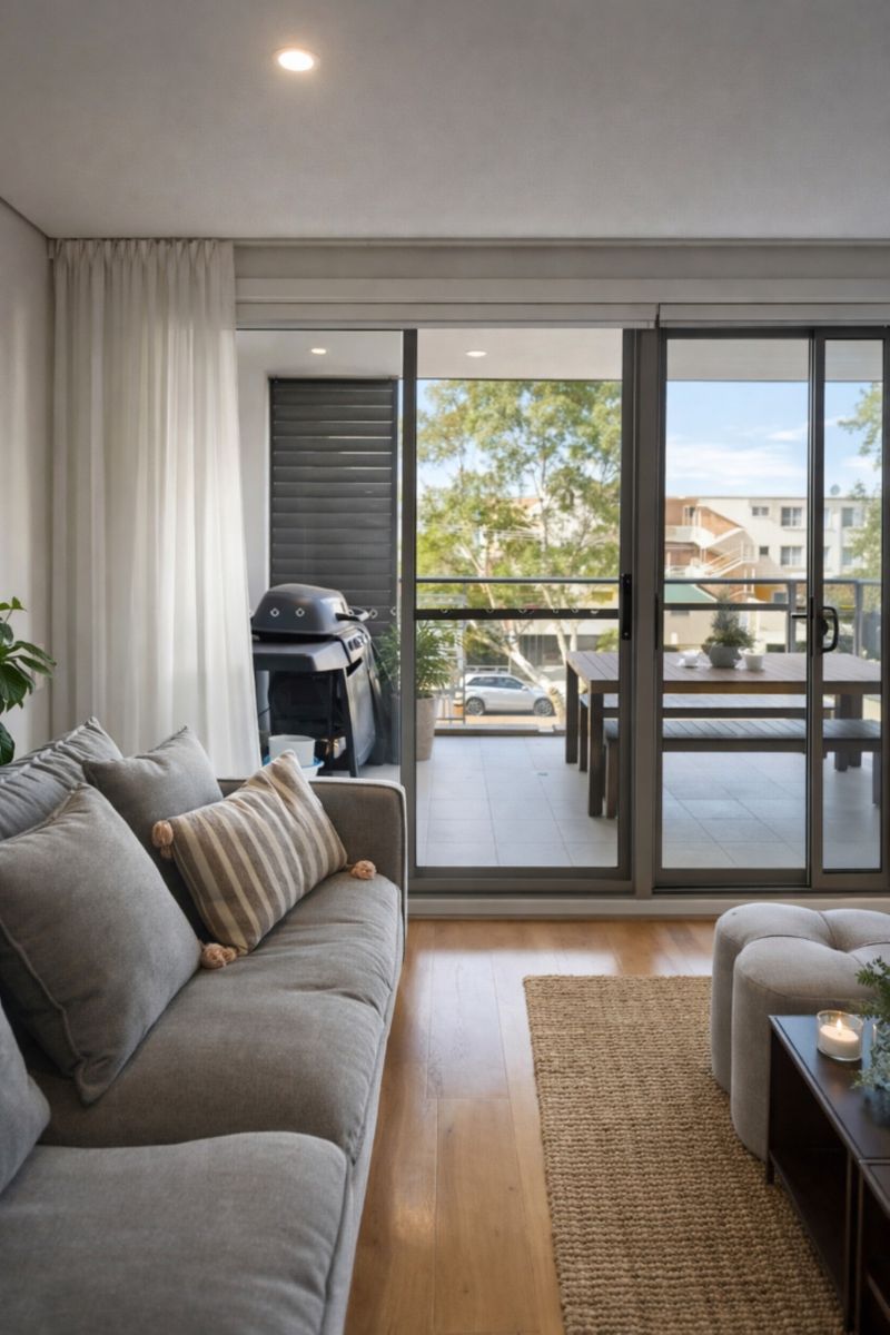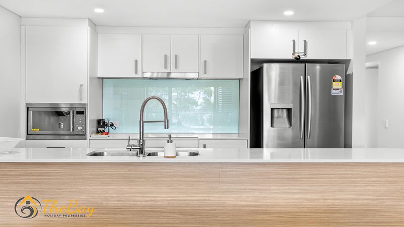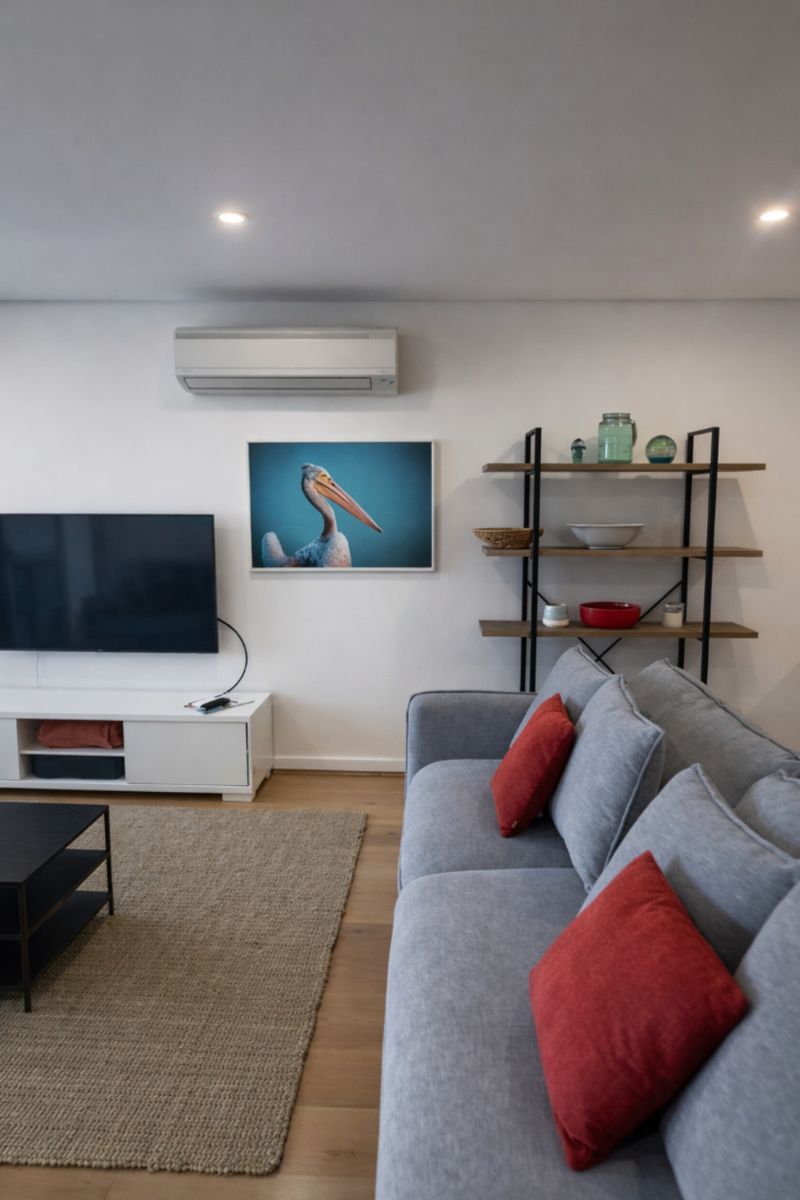 Open plan air-conditioned living area, fully equipped kitchen with oven, induction cooktop, coffee machine, dishwasher, microwave and stone benchtops.